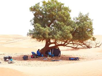Zur Mittagszeit macht ihr eine lange Pause im Schatten, wo ein warmes, frisch zubereitetes Mittagessen auf dich wartet – direkt in der Wüste gekocht.
