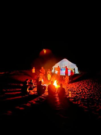 Am Nachmittag geht es weiter durch die stille, beeindruckende Landschaft, bis ihr einen passenden Platz für die Nacht findet. Dort werden die Zelte aufgeschlagen, ein wärmendes Abendessen serviert – und am Lagerfeuer wird nicht nur gemeinsam musiziert, sondern auch frisches Brot im Sand gebacken. Die Abende unter dem Sternenhimmel sind ein ganz besonderes Erlebnis.